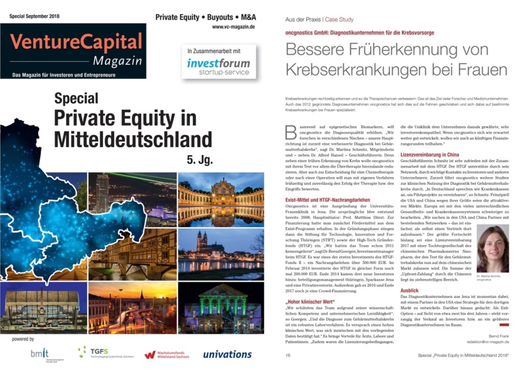 Ein Artikel über oncgnostics ist in der Spezialausgabe des VentureCapital Magazin zum Thema „Private Equity in Mitteldeutschland“ erschienen. Dabei wird oncgnostics als Beispiel für eine solche Finanzierung präsentiert. Schließlich gibt es hier schon länger gute Beziehungen zu vielen Investoren. Genannt werden der High-Tech Gründerfonds (HTGF), die Stiftung für Technologie, Innovation und Forschung in Thüringen (STIFT), das beteiligungsmanagement Thüringen (bm|t), Sparkasse Jena-Saale-Holzland sowie zwei Crowdfinanzierungen, die ausgesprochen erfolgreich über die Plattform Seedmatch liefen. Auch der Tätigkeitsschwerpunkt von oncgnostics, die Verbesserung der Diagnostik zur Früherkennung von Gebärmutterhalskrebs, wird erklärt.