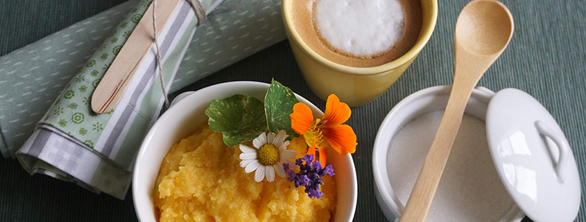 vermutlich kennen die wenigsten Leser den Begriff Sterz für Polenta, den gelben Maisgrieß. Sterz mit Häferlkaffee hat mich durch meine Kindheit und Jugend begleitet, denn dieses Gericht stammt aus der steirischen Heimat meiner geliebten Omi. Sterz gab es bei uns meist als Abendessen, er kann aber genauso gut als Frühstück zubereitet werden. Wir Kinder bekamen damals den typischen Malzkaffee. Wenn ich mir heute diese Speise zubereite, dann darf es ruhig auch ein Cappuccino sein.