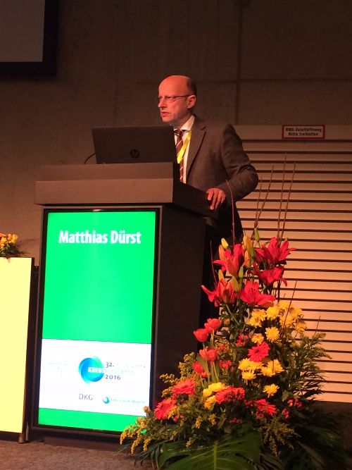 Großes Interesse weckte Prof. Dr. Matthias Dürst, Leiter der „Gynäkologischen Molekularbiologie“ an der Universitätsfrauenklinik Jena. Prof. Dürst stellte dem interessierten Fachpublikum aktuelle Studienergebnisse zum Früherkennungstest GynTect vor. Dabei ging es vor allem darum, die Vorhersagegenauigkeit von GynTect zu belegen, ob bei Zellveränderungen Gebärmutterhalskrebs entstehen wird oder nicht.