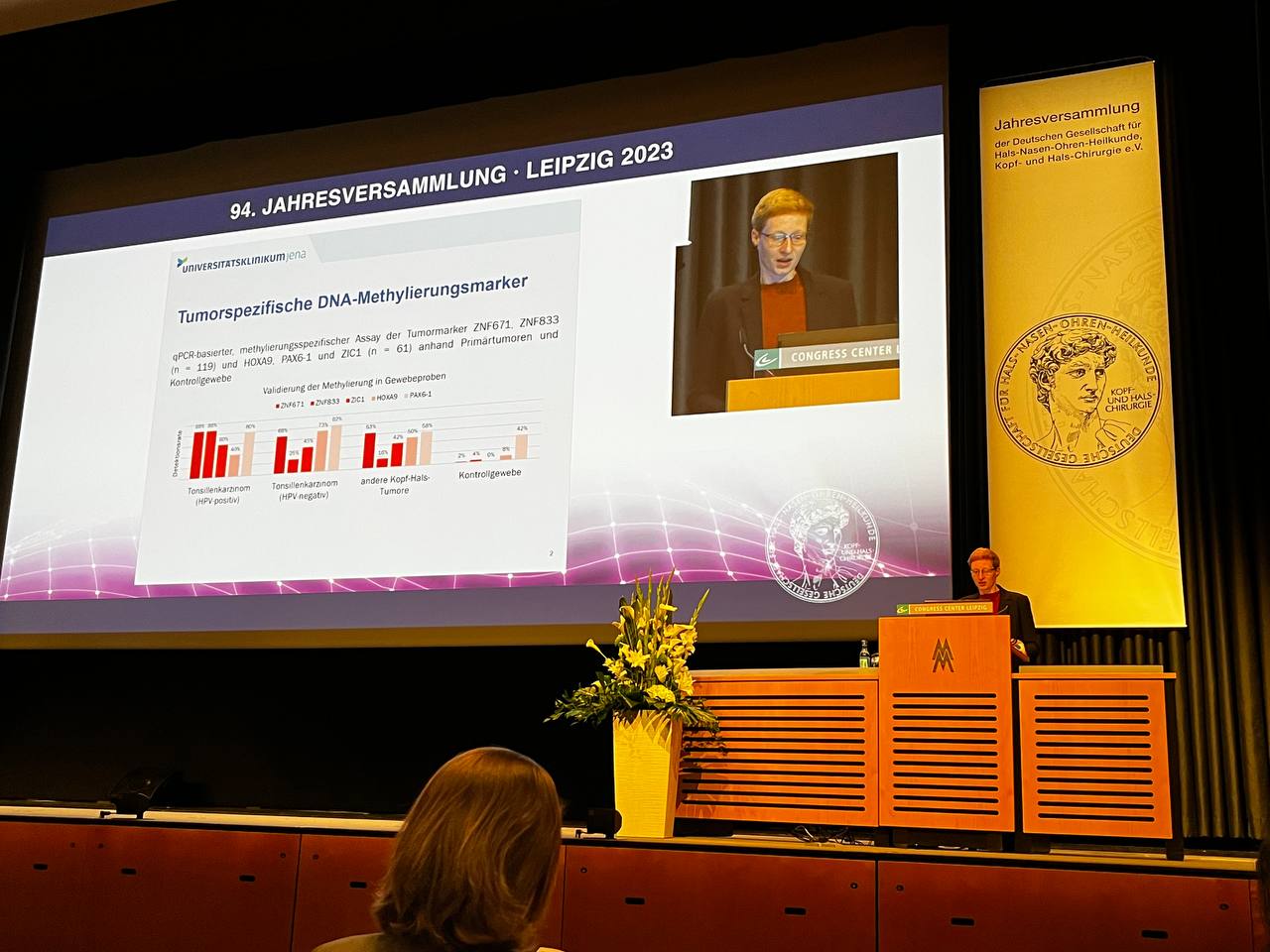 Da oncgnostics Kooperationspartner der OncSaliva Studie ist, stellte Anna-Bawany Hums die bisherigen Ergebnisse der Studie auf der Jahresversammlung der DGHNO 2023 einem großen Fachpublikum vor. Die Forschungsstudie wurde von Prof. Dr. med. Orlando Guntinas-Lichius initiiert und hat die Entwicklung epigenetischer Tumormarker zum Nachweis von Kopf-Hals-Tumoren in Speichelproben zur Anwendung als in-vitro-Diagnostikum zum Ziel.